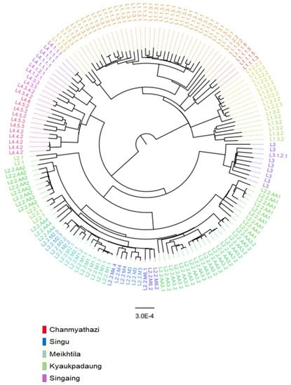 The distribution of sublineages and the biodiversity in Mandalay region and Kayin state are shown in Table 2. The overall Simpson’s indices were 0.0709 in Mandalay and 0.072885 in Kayin. Sublineage L1.1.3.1 was the most common (n = 31), followed by L2.2.AA3.2 (n = 17), which was available only in Mandalay. In Kayin, the most prominent sublineages were L1.1.3.1 (n = 17) and L1.3 (n = 17). The latter was only in Kayin.