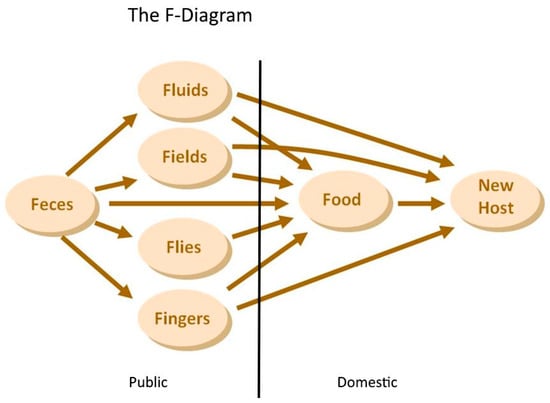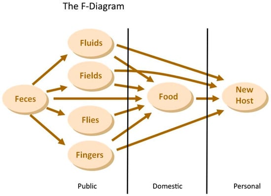 This paper will depart from the F-diagram to investigate whether the missing apparent connection between water quality and health is simply caused by methodological problems or by an actual lack of causality. However, to fully utilize its potential for transmission route analysis and to illustrate the points where we physically currently assess the routes, the F-diagram should be divided into the two spatial domains (Figure 1), as suggested by Cairncross et al. [20]—the public domain and the domestic domain.