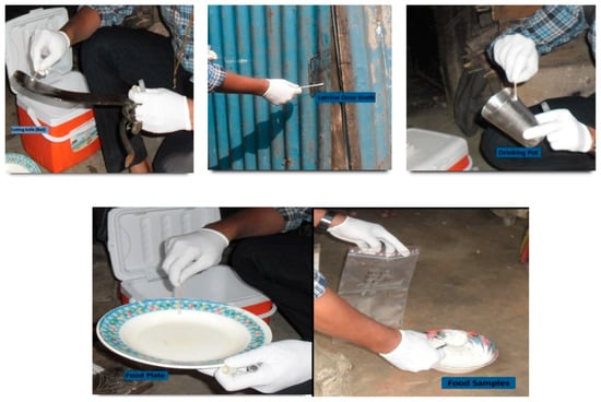 - Gil, A.I.; Lanata, C.F.; Hartinger, S.M.; Mäusezahl, D.; Padilla, B.; Ochoa, T.J.; Lozada, M.; Pineda, I.; Verastegui, H. Fecal contamination of food, water, hands, and kitchen utensils at the household level in rural areas of Peru. J. Environ. Health 2014, 76, 102–106. [Google Scholar]