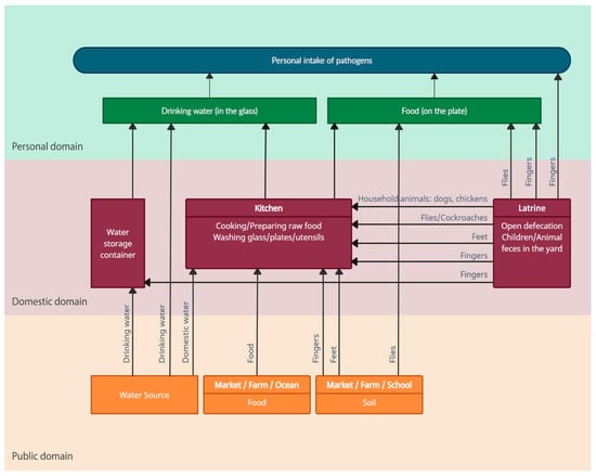 The domestic domain pertains to the areas inside household compounds, where pathogens are exchanged/recirculated between the kitchen, latrine, etc., by persons, domestic animals, or vectors such as flies and cockroaches.
