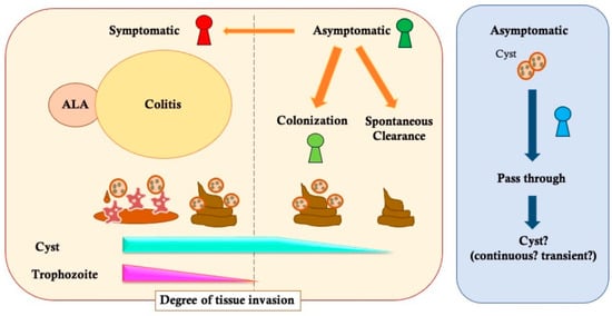 Currently, there are two different axes to diagnose E. histolytica infection: one axis is based on ‘symptomatic’ vs. ‘asymptomatic or colonization’ infection in the individual level, while the other axis is based on ‘invasive’ vs. ‘non-invasive’ infection associated with inflammation in the tissue level. The word ‘invasive’ infection is used in many studies as having the same definition as ‘symptomatic’ infection because those symptoms are directly and indirectly caused by invasion of parasite and tissue damage by E. histolytica infection (Figure 1) [1,6,46,47,48]. In the stage of E. histolytica, the trophozoites have the potential to survive and damage human tissues, and the cyst has been recognized as a non-pathogenic infectious form that spreads to other hosts [6]. In clinical settings, the cyst form has often been detected in stools of asymptomatic or colonization individuals, and can be a diagnostic trigger for these individuals [4,49,50]. Thus, there are some reports that mostly recognized those cyst carriers as identical to ‘asymptomatic or colonization’ infection by E. histolytica [21,37,51]. These researchers believed that there were no clear tissue damages leading to invasive infection happened in asymptomatic individuals. However, as reports about asymptomatic cases diagnosed via endoscopy are compiled, new facts are coming to light about the pathogenesis of asymptomatic infection [5,17,23]. There are macroscopically visible lesions on the human colon detected via endoscopy, regardless of any cysts detected in stools [17]. Pathological approaches found host cell death, destruction of mucus layer, and infiltration of inflammatory cells in the lesion sites. In fact, we reported the exacerbation by cases of asymptomatic chronic infection to acute colitis [42]. These facts indicate that E. histolytica can even cause tissue damage at the mucus level in asymptomatic individuals. In other words, the histological ‘invasive’ infection happens both in symptomatic and asymptomatic infection. Therefore, when the patients infected with E. histolytica are classified, it would be more appropriate to emphasize symptoms rather than invasive appearance.