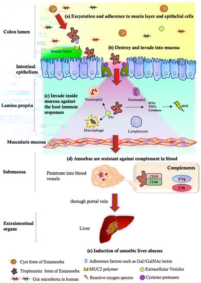 Steps of pathogenesis of Entamoeba histolytica invasive disease. (a) Cyst form of parasite is ingested by host and travels to terminal ileum region where it undergoes excystation, releasing trophozoites. Trophozoites then adhere to intestinal mucosa using surface proteins and glycoproteins. (b) Trophozoites use enzymes to destroy protective mucus layer of intestinal wall and penetrate mucosa. This act causes tissue damage and inflammation, leading to symptoms such as abdominal pain, diarrhea, and bleeding. (c) Parasite evades host immune system by changing surface antigens frequently, which prevents host antibodies from recognizing and attacking it. Additionally, it can suppress the host immune response and even kill immune cells. (d) Parasite is resistant to the complement system in blood, which is part of innate immune system that can destroy invading pathogens. E. histolytica can produce a glycoprotein that inhibits complement system, allowing it to evade immune attack. (e) In some cases, parasite can invade bloodstream and travel to other organs, such as liver, where it can cause abscesses. This can occur when trophozoites penetrate intestinal wall and enter portal circulation.