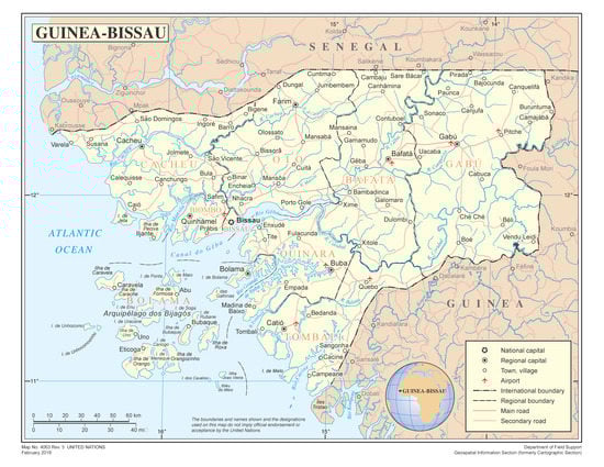 Map of Guinea-Bissau, https://www.un.org/geospatial/content/guinea-bissau (accessed on 26 March 2021).