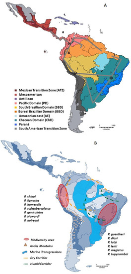The wide distribution of P. geniculatus, P. rufotuberculatus, P. lignarius, and P. megistus could be indicative of their antiquity, which would imply more time for dispersion. The restricted distribution of some species in the PD, the northern region of the SATZ (P. humeralis, P. howardi, and P. chinai), and the ChD (P. diasi, P. guentheri, P. lenti, P. lutzi, P. tupynambai and P. noireaui) would suggest possible speciation events by differentiation and adaptation to specific environmental conditions in each ecotope. These could be recent events (Figure 2A,B).