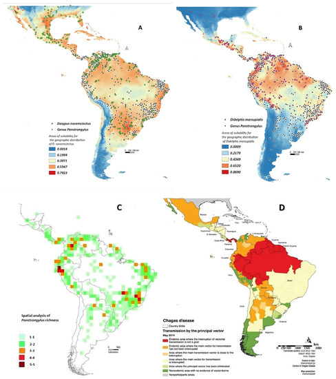 Modelling showed that Panstrongylus species richness overlapped with high Dasypus/Didelphis (potential blood source for this vector) areas, all coinciding with CD cases (latest 2014). This scenario of overlap would be a potential risk factor for an increase in the incidence of this anthroponotic disease (Figure 3C,D) [11,72,73,74]