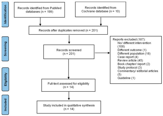 During the search, we identified 199 records from the PubMed database and ten records from the Cochrane Library database. We found eight duplicate records. A total of 201 articles were screened for the title and abstract. This initial screening excluded 187 irrelevant articles with various reasons, i.e., incompatible intervention (108), outcome (1), population (18), and type of articles (i.e., case report/series (4), review (45), book chapter/report (2), protocol (3), commentary/editorial (5), and guideline (1)). We finally performed a full-text screening of 14 articles for the qualitative analysis. The heterogeneity in populations, interventions, and outcomes across the included studies prevented quantitative analysis. The flow diagram of the included articles is presented in Figure 1.