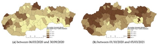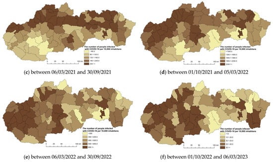 Since 2020, the world has experienced a pandemic, the consequences of which have been unprecedented in the last century. Life in the world, including in Slovakia, slowed down significantly for some time. Globalization played one of the important aspects in the spread of this disease, which, in addition to its positive effect, also has its risks. We detected the first case of COVID-19 in Slovakia on 6 March 2020. It was 4 months after its first discovery in China. The disease was imported to Slovakia from 52 countries. Most cases were from Austria, the United Kingdom, and Germany. Due to the threat to public health, the government of the Slovak Republic declared a state of emergency on the territory of Slovakia on 11 March 2020. As of 6 March 2023, since the beginning of the pandemic, 1,860,013 residents in Slovakia had been infected and registered (https://covid-19.nczisk.sk/sk) [49]. In the development of the number of people infected with the disease COVID-19 in Slovakia, we recorded alternating waves of infection with higher and lower values over three years. Officially, three waves of infection were recorded in Slovakia. The first wave (March 2020 to June 2020), the second wave (August 2020 to May 2021), and the third wave (September 2021 to May 2022). For a more detailed analysis of the infection development, we evaluated the overall situation over six periods chosen by us, which were divided into equal periods. Figure 2a–f documents the development of the infection in the observed periods from the point of view of regional differentiation in the districts of Slovakia.