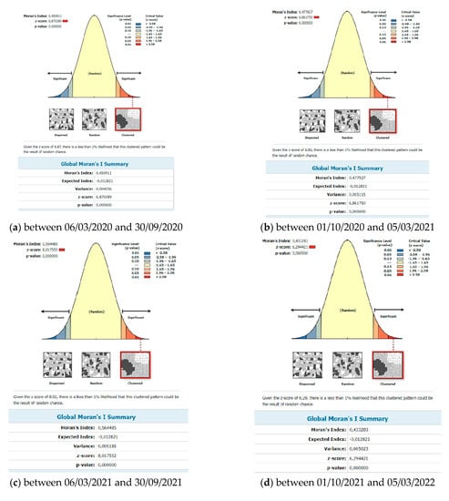 Knowing when and where outbreaks occur can lead to understanding the underlying causes of the COVID-19 virus and potentially predicting future outbreaks. There are various methods or techniques to reveal spatial patterns of disease, including cluster detection, hotspot analysis, and regression models. Various spatial statistical techniques for uncovering clusters are included in some geographic information system (GIS) software packages, as well as in various stand-alone programs. These programs include, for example, GeoDa. Global spatial cluster analysis and spatial correlations of the epidemic of COVID-19 between the districts of Slovakia were defined according to Global Moran I calculations, the values of which were higher than 0 (positive) for COVID-19 for all monitored periods (Figure 3). Moran’s indices took on values from 0.433283 to 0.591291. This is documented in Figure 4. The Z-score and Moran’s I indicate that the incidence of COVID-19 was positively and spatially correlated between regions. Moran’s I results show that positivity for COVID-19 was spatially clustered in the study area.