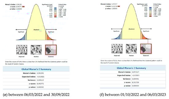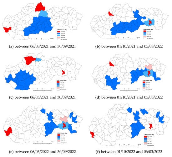 The number of confirmed cases of COVID-19/10,000 population was calculated using GeoDa software to clarify global spatial correlation characteristics. The use of spatial reference data on the number of people infected with the disease COVID-19 in Slovakia offers us an understanding of spatial-analytical links in this area of interest. With the spatial autocorrelation method, clusters of regions can be defined from the point of view of the monitored indicator. On the territory of Slovakia in the first period, we identified one compact region in the low–low quadrant, which is made up of 12 districts in the southern part of central Slovakia. Isolated in the next quadrant (high–high) are the districts of Námestovo, Tvrdošín, and Dolný Kubín. In the western part of Slovakia, they are joined by the districts of Senec and Bratislava I–V. By analyzing the monitored indicator in this period, we identified 14 districts, mainly in the southern part of Slovakia, which we classified in the low–low quadrant. The manifestation of positive spatial autocorrelation is also observed in the districts of Ilava and Košice I–IV, which belonged to the high–high quadrant. The negative spatial autocorrelation is in the Košice-okolie district and belongs to the low-high quadrant. In the next monitored period between 6 March 2021 and 30 September 2021, the situation from the point of view of the monitored indicator changed, primarily in the localization of the created clusters. In the western part of Slovakia, a rather significant low–low cluster was formed, which included 20 districts of Slovakia. Positive spatial autocorrelation was observed in the districts of Žilina, Kysucké Nové Mesto, Bytča, Považská Bystrica, and Košice I–IV. The given group of districts was included in the high–high quadrant. Changes were observed in analyses of the phenomenon of spatial autocorrelation in the given period. We can conclude that on the basis of the spatial autocorrelation created in this period, the districts of Ilava and Košice I–IV were located in the high–high quadrant. Isolated in the next quadrant (low–low) are three districts in the western part (Nitra, Levice, Nové Zámky). Towards the east, they are joined by the districts of Rimavská Sobota, Revúca, Rožňava, Gelnica, and Trebišov. Prešov district appears separately in the high–low quadrant and the Košice-okolie district in the low–high quadrant. In the period between 6 March 2022 and 30 September 2022, we observed manifestations of positive but also negative spatial autocorrelation. The first cluster of the high–high type in this period is located in the districts Košice I–IV, Bratislava I–V, Pezinok, and Senec. The localization of the districts that were included in the low–low quadrant is represented in a mosaic. These were eight districts, mainly in the eastern part of Slovakia. High–high cluster with districts Bratislava I–V and Košice I–IV. Districts located in several parts of Slovakia (Tvdošín, Poprad, Stará Ľubovňa, Stropkov, Humenné, Rožňava, Revúca, Rimavská Sobota) are characterized by positive spatial autocorrelation, specifically by representation in the low–low quadrant (Figure 5a–f).