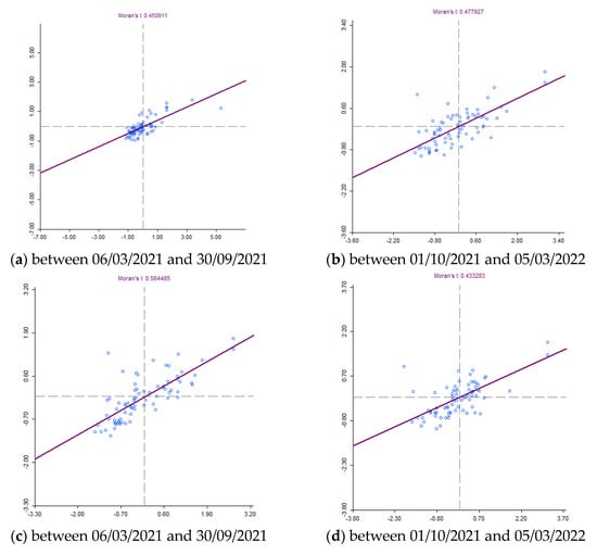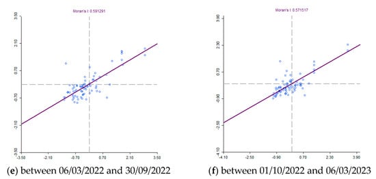 Moran’s I diagram for the number of people infected with COVID-19 per 10,000 inhabitants in Slovakia between 6 March 2020 and 30 September 2020, and between 1 October 2022 and 6 March 2023.