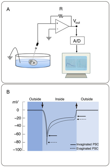 Electrical recordings were obtained, as recently detailed [20]. Briefly, we used a single microelectrode high input impedance (>1011 Ω) amplifier–intracellular electrometer (Model IE-210, Warner Instruments, Hamden, CT, USA) with an internal 4-pole low-pass Bessel filter set at 20 kHz and a sampling rate of 10 kHz. The electrometer was connected in parallel to an analog–digital converter (TL-1 interface. Tecmar, Solon, OH, USA) that fed the digital input of a personal computer running Axograph (Axon Instruments, Union City, CA, USA) as a digital oscilloscope. Microelectrodes from glass capillaries (Biocap, Buenos Aires, Argentina), with 1.25 mm internal diameter, were pulled on a PB-7 pipette puller and heat-polished on an MF-9 pipette polisher (Narishige, Tokyo, Japan) and filled with filtered 3 M KCl solution. The reference electrode was a wider-tip glass capillary, filled with 3 M KCl solution, connected to a Cl-plated silver wire (Ag/AgCl) and the ground socket of the electrometer. Tip resistance ranged between 10 and 40 MW. The recording chamber consisted of a glass slide, where an aliquot (500 μL) of a parasite suspension was added (~100 PSCs/mL). Parasites were impaled after being individually captured and held with a suction micropipette (Figure 1A). Impalements were performed under optical microscopy with an IMT2 Olympus inverted microscope (×10).