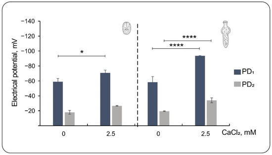 Effect of external Ca2+ reduction on the electrical potentials of PSC from E. granulosus. Values for invaginated PSCs (left) and evaginated PSCS (right) are expressed as changes in the normalized negative potentials (see Appendix A). PD1 represents the peak of the transient potential; PD2 represents the stable plateau potential. Values are the mean ± SEM for n between 30 and 60. Symbols * indicate statistically significant differences, with * p < 0.05 and **** p < 0.0001.