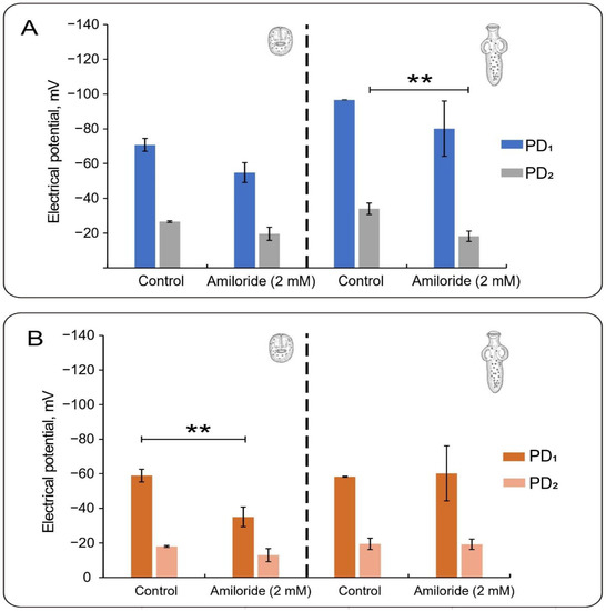 Effect of amiloride on the electrical potentials of PSC from E. granulosus. (A) PD1 and PD2 values for invaginated (left) and evaginated PSCs (right) in 2.5 mM Ca2+ (RKS) with or without amiloride. (B) PD1 and PD2 values for invaginated (left) and evaginated PSCs (right) in low external calcium (1 mM EGTA) with or without amiloride. Electrical potentials are expressed as changes in the normalized negative potentials (see Appendix A). Values are the mean ± SEM for n between 30 and 60. ** indicate the statistically significant difference with p < 0.01.