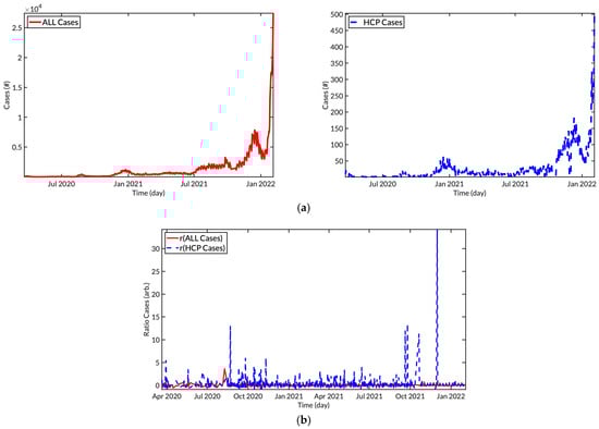 Daily trends of all COVID-19 cases (red line) and HCP COVID-19 cases (blue dotted line) (a), and the rate (b) reported in South Korea from 21 March 2020 to 4 February 2022.