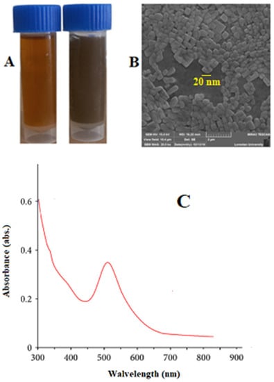 Figure 1A exhibits the equality, proper distribution, and homogeneity of Au-NCs. The quick decrease of the Au ions via S. khuzestanica extract caused the homogeneous nucleation of Au that resulted in the production of Au-NCs. The Au-NCs are restrained inside a surrounding substance of extract, which probably contains biomolecules that are stabilizers or covering causes in synthesis. The synthesized Au-NCs are cubes and have an average size of 20–30 nm (Figure 1B). The absorption peak of nanoparticles obtained from the Vis-UV was observed at 511 nm, indicating the presence of silver nanoparticles.