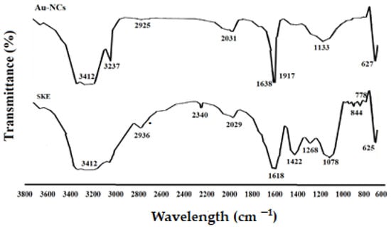 The attendance of secondary metabolites, which are accountable for the covering and lessening of the HAuCl4 to Au-NCs, was examined by FTIR examination. As shown in Figure 3, the same FTIR spectrums of the extract and Au-NCs, confirmed the green synthesis of Au-NCs. The attendance of several IR bands is associated to the presence of various functional groups in the extract. The peaks at 1078, 1268, 3412, and 2936 cm−1 are linked to C–O, C–O–C (oligosaccharides or in triacylglycerols), O–H, and C–H (carbohydrates) stretching, respectively. While the peaks in the range 1618–2029 cm−1 were probably linked to the saturated hydrocarbons (Csp3–H), C=C, and C=O stretching.