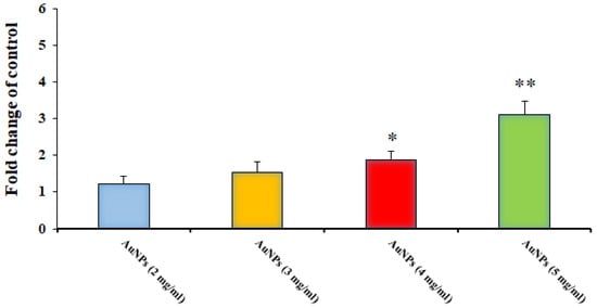As shown in Figure 6, by real-time PCR, we found that after treatment of protoscoleces with Au-NCs, the gene of caspase-3 was dose-dependently upregulated compared with the control group (p < 0.05), so that Au-NCs at 4 and 5 mg/mL significantly upregulated the expression level of the caspase-3 gene.