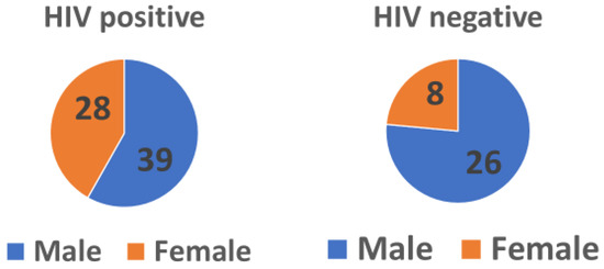 The number of patients enrolled in the study was 101. Of these, 65 (64.4%) were males and 36 (35.6%) were females. Among all these patients, 67 (66.3%) were HIV-positive, while 34 (33.7%) were HIV-negative. About half of the participants, 52 (51.5%), belonged to the economically active age group (Table 4). Gender is a risk factor associated with treatment outcomes with a p-value of 0.012, and HIV status had a marginal p-value (0.05). More males were co-infected with HIV-TB (Figure 1) than females.