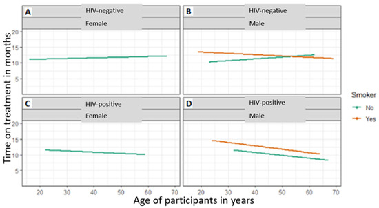 All female patients were non-smokers as highlighted by Figure 3A,C. HIV-negative males’ period of treatment outcomes decreased with an increase in age (Figure 3B). Both non-smoking females and males had an increased period of treatment outcomes with an increase in age. HIV-positive male smokers took longer under the treatment compared to non-smokers (Figure 3D). Both the smoking and non-smoking HIV-negative or -positive period of treatment outcomes decreased with an increase in age (Figure 3A,B).