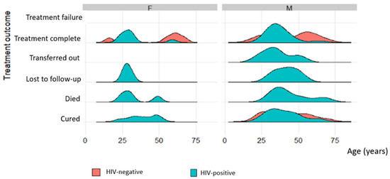 In both genders, there were no HIV-negative patients that died or were lost to the follow up. There were more HIV-negative patients that were cured and had completed treatment (in both genders) in the younger and older age groups compared to the economically active age group. Only HIV-positive patients in the economically active age group were transferred out (Figure 7).
