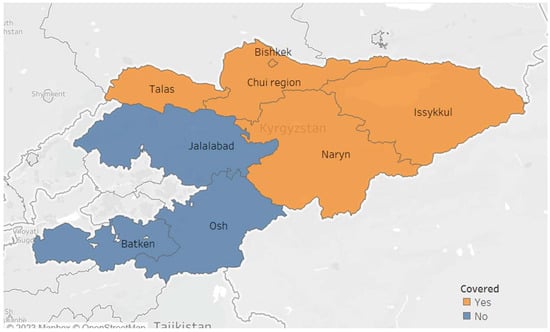 Map of the Kyrgyz Republic showing the regions covered by the “Together against TB” project engaging private providers in tuberculosis in 2021–2022.