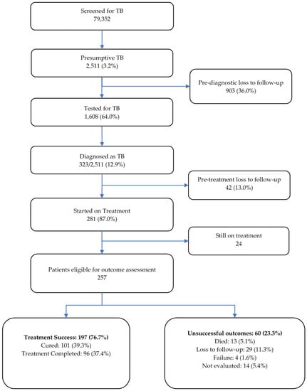 - Squire, S.B.; Belaye, A.K.; Kashoti, A.; Salaniponi, F.M.L.; Mundy, C.J.F.; Theobald, S.; Kemp, J. “Lost” Smear-Positive Pulmonary Tuberculosis Cases: Where Are They and Why Did We Lose Them? Int. J. Tuberc. Lung Dis. 2005, 9, 25–31. [Google Scholar] [PubMed]