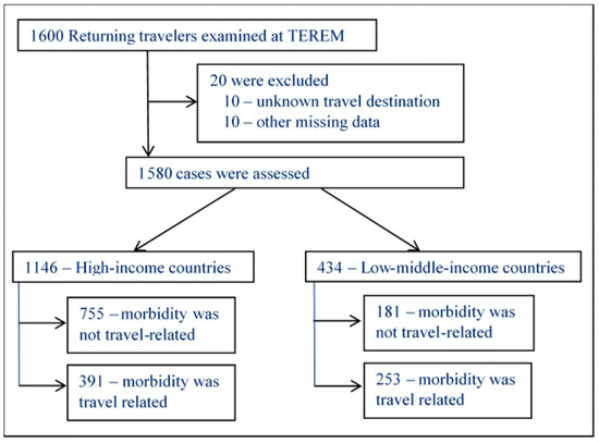 International travel has grown significantly in recent decades, accounting for approximately 1.4 billion travelers annually [1]. Although the COVID pandemic caused a significant decline in worldwide travel [2,3,4], the growth in international travel is spiking again. Over the years, the profile of the passengers has also changed and includes an increasing number of children and the elderly, those with chronic illnesses, and an increased rate of travel to exotic destinations, including low–middle-income countries (LMIC) [5,6,7,8,9]. Information about travel-related morbidity is important for health practitioners to diagnose disease in returning travelers and for consulting those seeking pre-travel advice. This knowledge is relevant to the designated pre- and post-travel clinics, but also to a diverse range of other health specialties, such as primary care physicians or urgent care settings, as travelers also access these facilities.