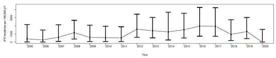 The annual incidence of IPD in PLWHA/100,000 person-years in Rio de Janeiro, Brazil, in 2005–2020.