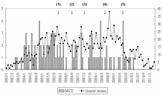 Since January 2004, a protracted outbreak of patients with B. cepacia bacteremia was noted in an ICU of a Taiwanese hospital (five cases in the first 2 months in 2004 compared to three cases in year 2003). The initial recognition of the outbreak occurred after determination that over ninety percent of total B. cepacia isolated in the hospital central laboratory were from this specific unit. Pulse-field electrophoresis in the early phase showed 67% of the isolates could be considered a single clone [10]. Repeated environmental surveillance cultures were performed but no obvious transmission route was found. Environmental cleaning was enhanced and a checklist was implemented to decrease central catheter use combined with restriction of imipenem prescription. Compartmentalization with walls between patient beds was also constructed in 2006. However, sporadic cases of bacteremia were still found. Contact isolation for all patients with B. cepacia colonization was implemented in this unit in 2007. The number of bacteremia cases decreased, but patients continued to be colonized or infected with B. cepacia intermittently.