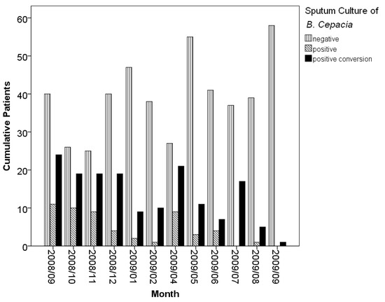 During the period of reusable ventilator circuits from September 2008 to May 2009, the baseline rate of sputum culture converting from negative to positive was 27.5% in spite of previous interventions including enhanced environmental cleaning, limitation of central catheter use, and contact isolation of patients carrying B. cepacia. This culture conversion rate significantly decreased to 22.6% and 5.8% under intervention of discontinuing reusable ventilator circuits for half and all patients, from June 2009 to July 2009 and from August 2009 to September 2009, respectively. Only three patients developed B. cepacia infection in the following months. The monthly numbers of patients colonized with B. cepacia also waned with time (Figure 1).