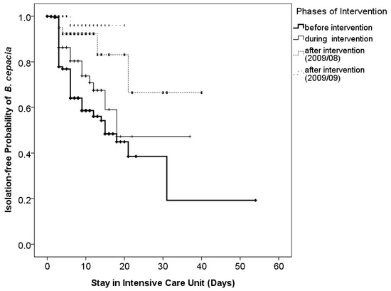 Discontinuing reusable ventilator circuits was the most influential factor identified in this study (Figure 2). With intervention of discontinuing reusable ventilator circuits since June 2009, the incidence of isolated B. cepacia declined. Furthermore, prolonged latency of transmission under the intervention was observed (Figure 3). The estimated 30-day isolation-free probabilities of the groups before, during, one month (August 2009) after, and two months (September 2009) after the intervention were 38.5%, 47.3%, 66.5%, and 96.0%, respectively (p < 0.01).
