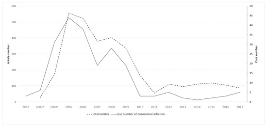 Six-year follow-up after the control of outbreak. Case numbers of nosocomial infection caused by B. cepacia and total isolate numbers of B. cepacia at FEMH. * Isolate numbers in 2003 and 2004 were lower due to the fact that data collection were incomplete before awareness of the outbreak and there were no data for 2002.