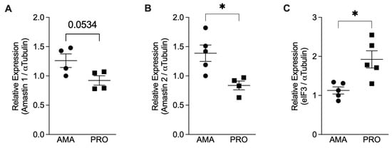 Relative mRNA expression analysis comparing Leishmania infantum amastigotes (AMA) and promastigotes (PRO). Total RNA from axenic promastigotes (PRO) and amastigotes (AMA) was used to prepare cDNA, and the relative expression of the genes for Amastin 1, Amastin 2, α-Tubulin, and elF3 was determined by qPCR. Results presented as mean ± SEM. (A) Amastin 1/α-Tubulin, (B) Amastin 2/α-Tubulin, and (C) eIF3/α-Tubulin observed in amastigotes and promastigotes of two independent experiments; * p < 0.05. Black circles correspond to amastigotes and black squares to promastigotes; Each symbol shows the result of a different amastigote or promastigote culture.