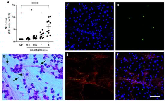 Axenic amastigotes induce the release of NETs. Human neutrophils (Nϕ) were incubated with (A) amastigotes at the different MOIs for 90 min and NET-DNA quantified in the culture supernatant. Data were normalized according to spontaneous DNA release (Ctrl) and are shown as mean ± SEM of four independent experiments; n = 10; * p < 0.01, **** p < 0.0001. Black circles represent individual donors. (B) Representative image showing NETs and amastigotes stained with panoptic kit. Arrows point to NET-trapped amastigotes. Bar: 50 µm. (C–F) Neutrophils were incubated with CSFE-labeled amastigotes (green) for 90 min. Cultures were fixed and stained for elastase ((E); red). (F) Merged image of (C–E). Images representative of two experiments. Bars: 20 µm.