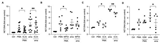 Neutrophil elastase and peptidyl arginine deiminases contribute to amastigote-induced NET release. Human neutrophils were pretreated or not (Ctrl) with (A) elastase inhibitor (ELAi), (B) myeloperoxidase inhibitor (MPOi), (C) chloroamidine (Cl-A), or (D) GSK-484 (GSK) for 30 min and then incubated with amastigotes (ama) or PMA for 90 min at 35 °C, 5% CO2. NETs were quantified in the culture supernatant using the PicoGreen kit. Data normalized according to spontaneous DNA release (Ctrl) are shown as mean ± SEM of (A) three independent experiments (n = 7), (B) five independent experiments (n = 10), (C) three independent experiments (n = 4), and (D) three independent experiments (n = 6); * p < 0.05 and ** p < 0.01. Black circles correspond to individual donors.