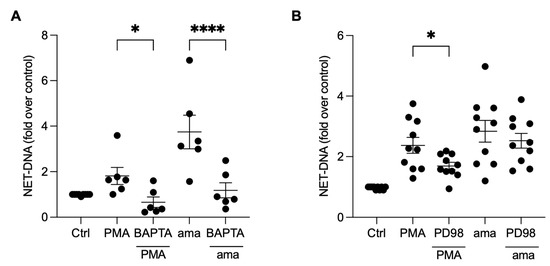 NET release induced by amastigotes requires calcium, but not ERK signaling. Human neutrophils were pretreated (A) in the absence or presence of BAPTA or (B) PD98 for 30 min and then incubated with amastigotes (ama) or PMA for 90 min at 35 °C and 5% CO2. NETs were quantified in the culture supernatant using the PicoGreen kit. Data normalized according to spontaneous DNA release (Ctrl) are shown as mean ± SEM of (A) three independent experiments (n = 6) and (B) four independent experiments (n = 10); * p < 0.05 and **** p < 0.0001. Black circles represent individual donors.