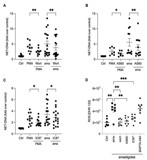 NETs induced by amastigotes depend on total PI3K, PI3Kγ, and PI3Kδ signaling pathways. Human neutrophils were pretreated in the absence or presence of (A) wortmannin (Wort), (B) AS60 (PI3Kγ inhibitor), or (C) IC87 (PI3Kδ inhibitor) for 30 min and then incubated with amastigotes (ama) or PMA for 90 min at 35 °C, 5% CO2. NETs were quantified in the culture supernatant. Data normalized according to spontaneous DNA release (Ctrl) and shown as mean ± SEM of (A) eight independent experiments (n = 18) and (B) seven independent experiments (n = 15); * p < 0.05, ** p < 0.01. (D) After treatment with inhibitors, cells were incubated with amastigotes for 120 min. ROS production was evaluated with the DHR 123 probe and analyzed using a spectrofluorometer reader. Results expressed as arbitrary units. Results shown as mean ± SEM of three independent experiments (n = 7); * p < 0.05, ** p < 0.01, and *** p < 0.001. (A–D) Symbols represent individual donors. (D) Circles (ctrl), squares (ama), triangle (wort + ama), inverted triangles (AS60 + ama), diamonds (IC87 + ama) and hexagons (BAPTA + ama).