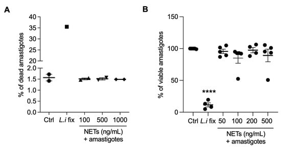 NETs are not toxic to axenic amastigotes. Amastigotes were incubated with NETs at the indicated concentrations, at 35 °C, 5% CO2, for 5 h and analyzed using (A) flow cytometry or (B) alamar blue assay. Results expressed as the percentage of (A) dead amastigotes out of 100,000 analyzed events and as (B) viable amastigotes. Data shown as mean ± SEM of (A) two independent experiments and (B) five independent experiments; **** p < 0.0001. L.i fix: Leishmania infantum fixed in 4% formaldehyde. (A,B) Symbols correspond to different experiments.