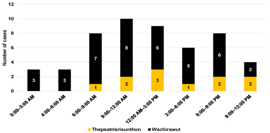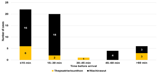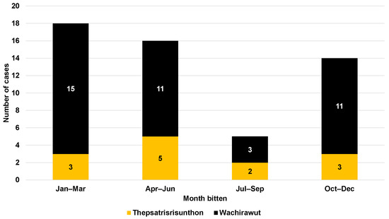 Regarding neurological symptoms, only one patient from Fort Wachirawut hospital reported muscle weakness, ptosis, and respiratory failure (Table 1). The majority of snakebite victims arrived at the hospital within an hour of being bitten (88.7%), with a median time of 20 min (IQR, 15 to 30) for Fort Wachirawut hospital and 17.5 min (IQR, 10 to 140) for Fort Thepsatrisrisunthon hospital (Figure 2). Notably, 22 patients arrived within 15 min of being bitten, and 20 patients arrived within 15–30 min. Figure 3 shows that around two-thirds of the study participants were bitten in the period from January to June, with only 9.3% being bitten from July to September.