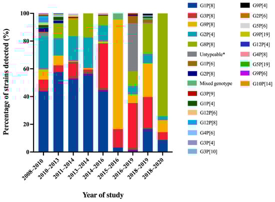 Distribution of Rotavirus A Genotypes in Pediatric Patients with Diarrhea in Thailand from 2008 to 2020. * No amplicon/no PCR product/unsuccessful sequencing.