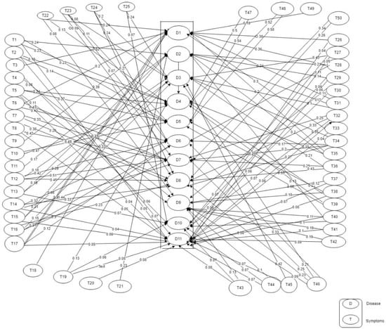 The causal relationship between the symptoms of a particular disease and the disease is shown on a fuzzy cognitive map (FCM). A synergy is established amongst the eleven diseases identified as febrile due to their similarity in symptoms and the aetiology of the disease. The value attached between each of the symptoms and its corresponding disease represents the weight of the symptom to the disease and, therefore, its causal value. The concepts (symptoms and diseases) for the differential diagnosis of the eleven diseases are shown in Appendix B. There are 61 concepts comprising 50 class concepts (symptoms), labelled T1 to T50, and 11 decision concepts (diseases), labelled D1 to D11. The corresponding map (FCM) is shown in Figure 2.