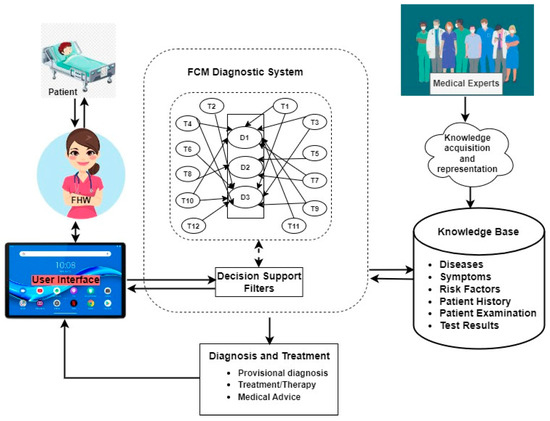 The components of the system interact with one another, as depicted in the architectural design in Figure 3, which comprises the medical experts, the frontline healthcare workers (FHWs), the patients, the knowledge base, the diagnostic engine, the FCM engine, the decision-support filters, and the graphic user interface as the main components. A patient’s signs, symptoms, and laboratory test results are captured into the knowledge base through the graphic user interface by the FHWs. This information is stored in the knowledge base of the system along with static and dynamic (experiential) knowledge of the medical experts for later use by the diagnostic engine of the system for processing. The risk factors and emotional feelings of a patient are captured through the decision support filters to the diagnostic engine. The knowledge base feeds the diagnostic engine, which first fuzzifies the datasets and then maps the corresponding signs and symptoms with the appropriate diseases. The computed values are thereafter defuzzified into crisp outputs and sent back to the FHWs as the diagnostic results.