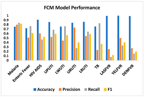 A binary classification of the results into patients diagnosed with a specific disease and those not diagnosed was carried out on the actual and predicted (computed) results. The performance evaluation of the 11 diseases is shown in Figure 4 and Table 6. From the results of these metrics, the true positive (TP), true negative (TN), false negative (FN), and true negative (TN) values were extracted, as shown in Table 7, while Table 8 presents the actual and predicted diagnosis for each disease. The average accuracies of 87%, precision of 53%, recall of 50%, and F1 of 51% were recorded. Four diseases (LWUTI, TB, LASFVR, and DENFVR) performed below 50% precision measure, while URUTI, LASFVR, YELFVR, and DENFVR performed below 50% of recall and the F1 measure had URUTI, TB, LASFVR, YELFVR, and DENFVR below 50%. Malaria has the highest number of diagnoses, of 1631 actual diagnostic results and 1721 predicted diagnoses. This is followed by enteric fever with 710 actual and 1072 predicted diagnoses.
