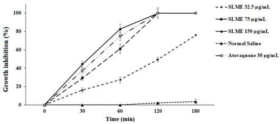 Figure 1. In vitro activity of different concentrations of the SLME on the growth inhibition of T. gondii tachyzoites after 0.5, 1, 2, and 3 h treatment. Results are displayed as the mean ± SD. The experiments were performed in triplicate.