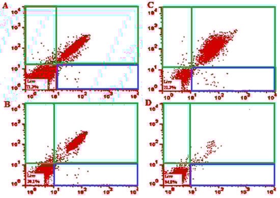 Figure 2. The effects of Stachys lavandulifolia methanolic extract at 32.5 μg/mL (A), 75 μg/mL (B), 150 μg/mL (C), and normal saline + Tween 20 as solvent (D) on the level of apoptotic and necrotic cells in Toxoplasma gondii tachyzoites, by flow cytometry analysis. (i) Early apoptosis; (ii) late apoptosis; (iii) necrotic cells.