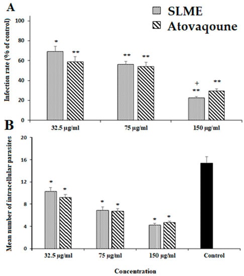 Figure 3. Effects of Stachys lavandulifolia methanolic extract (SLME) and atovaquone (30 μg/mL) on infectivity rate (A) and intracellular parasites (B). (n = 3). * p < 0.05; ** p < 0.01 compared with the control; + p < 0.05 compared with atovaqoune.