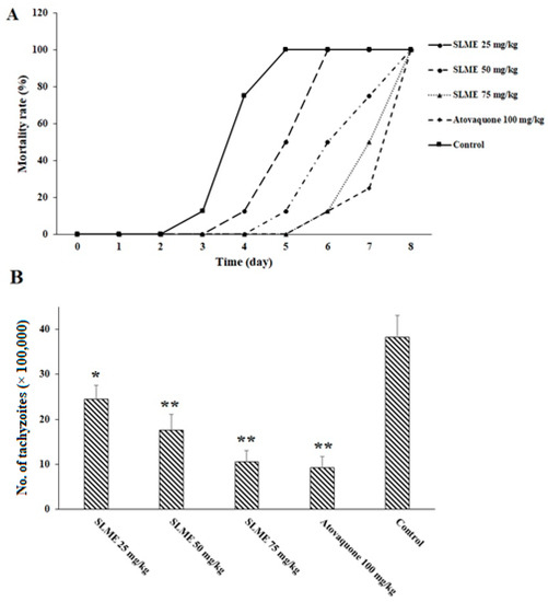 Figure 4. The mortality rate of mice (A) and the parasite load (at 1 mL of peritoneal exudate) on the 3rd day post-infection (B) receiving the SLME at the doses of 25, 50, and 75 mg/kg/day for two weeks compared with the control group (normal saline). * p < 0.01 and ** p < 0.001 compared to the control.