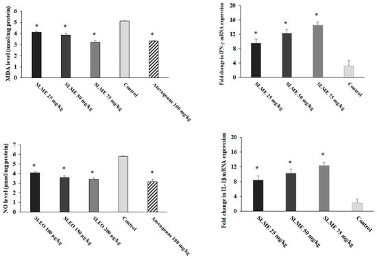 Figure 5. The level of MDA, NO, as well as IFN-γ and IL-1β expression levels in the infected mice (three mice from each group) receiving SLME at the doses of 25, 50, and 75 mg/kg/day for two weeks compared with the control group (normal saline). Results are displayed as the mean ± SD. * p < 0.01.