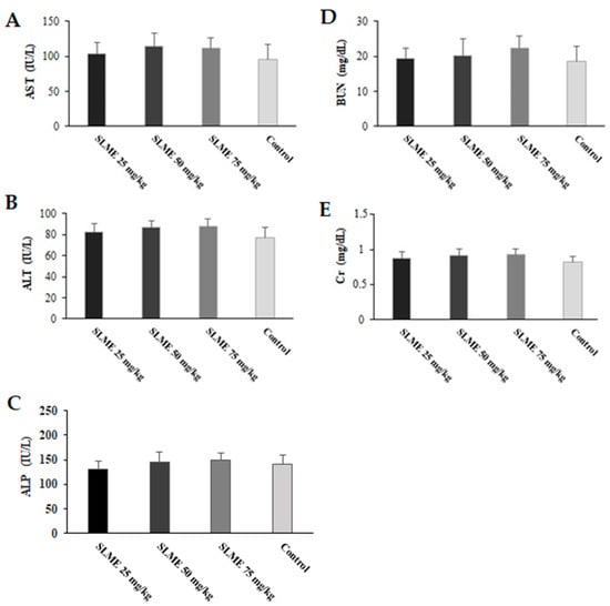 Figure 6. Effect of oral administration of SLME at the doses of 25, 50, and 75 mg/kg/day for 14 days on the serum level of AST, aspartate aminotransferase (A); ALT, alanine aminotransferase (B); ALP, alkaline phosphatase (C); BUN, blood urea nitrogen (D); and Cr, creatinine (E). Results are displayed as the mean ± SD.