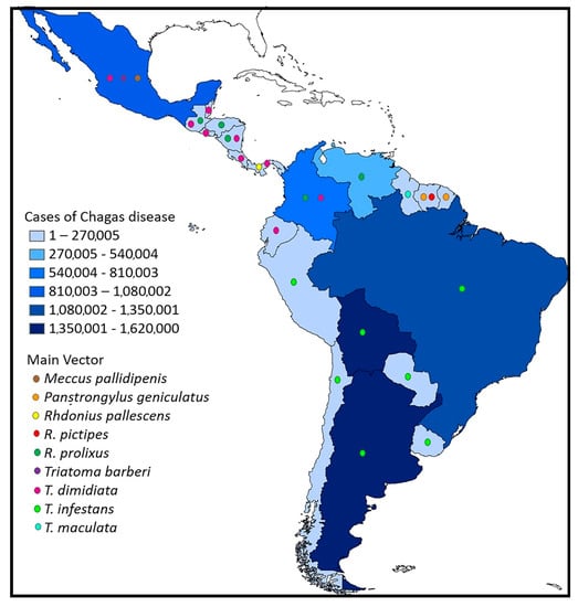 Chagas disease is widely distributed in 21 countries in the Americas (Figure 3) and currently affects between 6 and 7 million people worldwide [10]. The fact that this number has decreased from ~18 million people in previous decades is evidence of the effectiveness of chemical vector control campaigns [11]. Although the insect vector does not occur in Europe, the migration of infected people is causing serious problems, and the number of infected people outside the endemic range of the disease is increasing [12,13]. Therefore, it is important to address this problem from a multidimensional perspective under the migration approach [14].